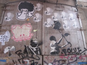 And then, the next day, it was all gone. I only realized on Monday that although the graffiti seemed like it was everywhere, it wasn’t really. While telephone and cable boxes were covered, almost all of the major paintings were on the corrugated metal sheets they use to cover shops at night. As a result, when the stores were open, much of the graffiti disappeared.
