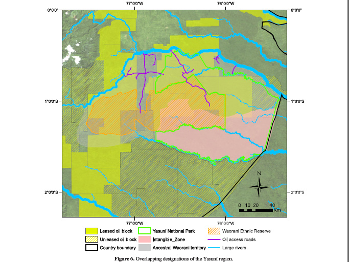 Many of the biggest problems with Yasuní-ITT can be explained by looking at a map. Yasuní is a UNESCO biosphere reserve; the park is its nucleus. The reserve also includes Huaorani territory and an “intangible zone” for the isolated indigenous groups.